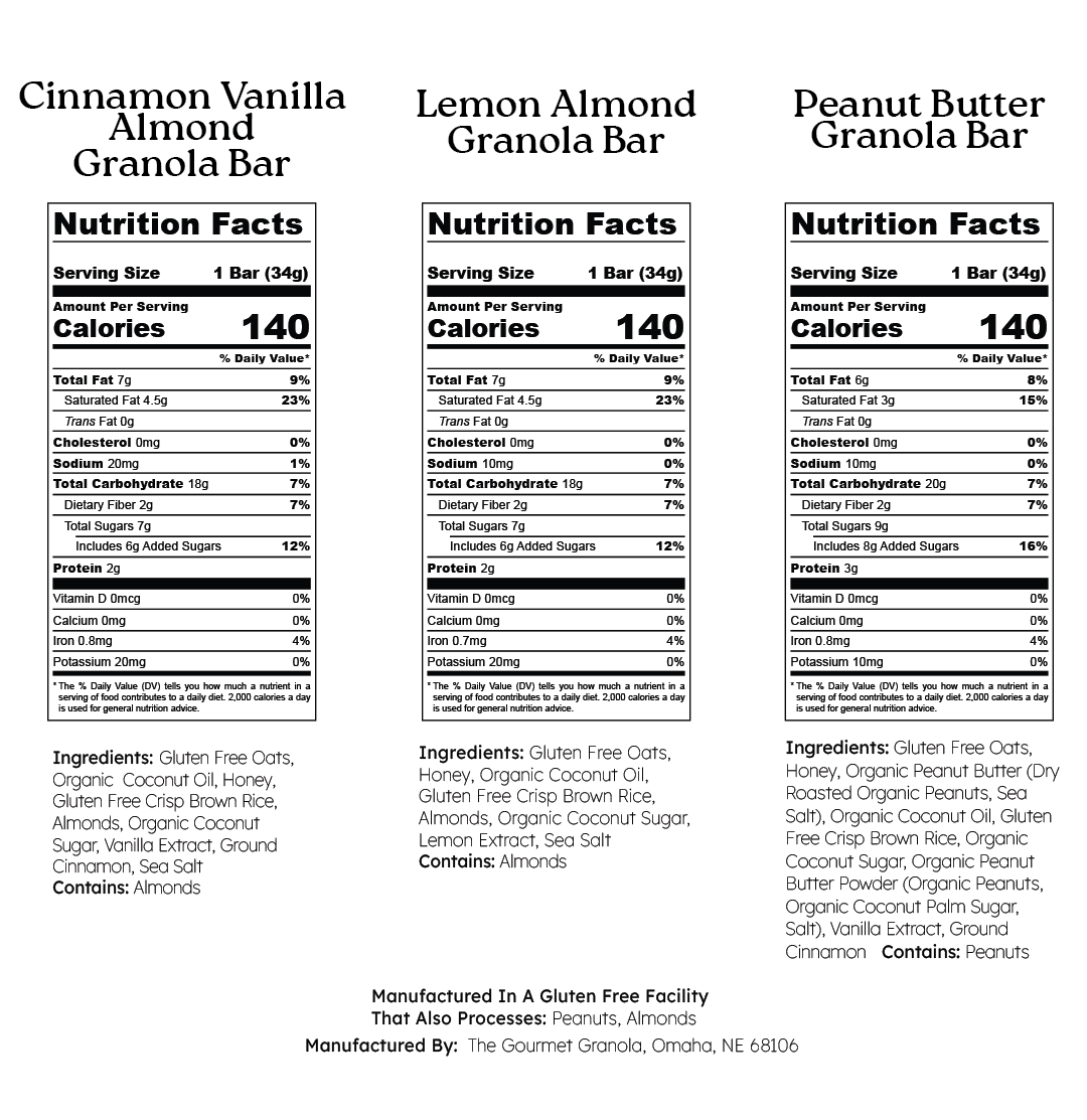 Gluten Free Oats, Organic Virgin Coconut Oil, Honey, Rice Cereal (Rice, Sugar, Corn Syrup, Salt), Almonds, Organic Coconut Sugar, Lemon Extract, Sea Salt